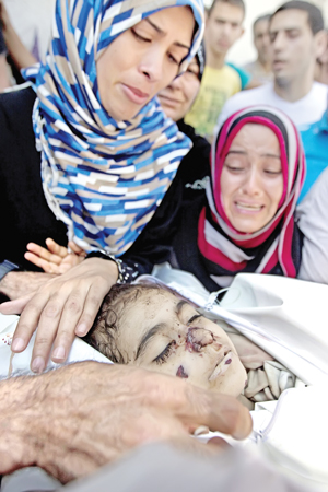 The mother and aunt of a Palestinian girl mourning during her funeral in Gaza City Thursday. At least 10 people were killed in Israeli strikes there on the day 24 of the conflict, taking the total death toll to 1,374. — AFP