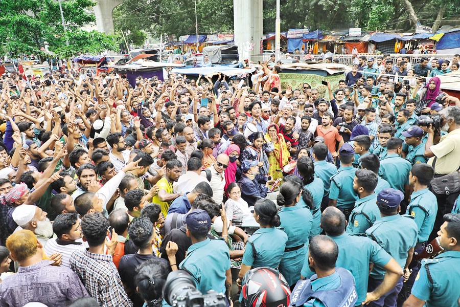 Police intercept at Shahbagh in Dhaka on Thursday the physically-challenged people as they march towards the national parliament under the banner of 'Sangkhubdho Protibondhi Nagorik Samaj' to press home their 11-point demand, including increasing their monthly allowance to minimum Tk 5,000. — FE photo