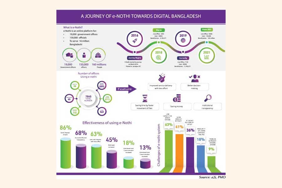 The use of 'e-nothi' or 'e-filing' in public offices under the Access to Information (a2i) Programme is leaping forward at a much quicker pace across the country despite a number of challenges.