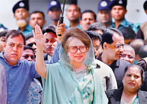 BNP Chairperson Khaleda Zia waving to supporters while appearing before a special court at Bakshibazar in the capital Wednesday in connection with two graft cases. — FE photo