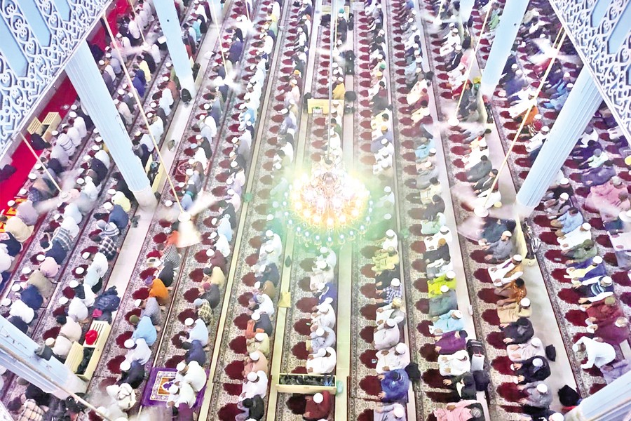 Muslim devotees offer prayers for Shab-e-Barat at the Baitul Mukarram mosque in the capital on Tuesday night. Prayers have been organised in mosques across the country marking the occasion. — Focus Bangla