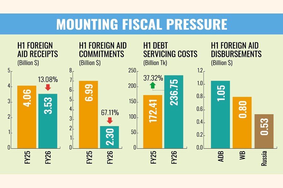 Bangladesh is facing a fiscal squeeze as foreign aid receipts declined during the first half (H1) of the current fiscal year, while the burden of repaying international debts reached new heights.