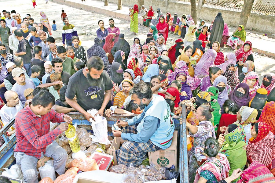 A group of women jostle near a TCB truck in the capital's Khilgaon area on Tuesday, as long queues of low- and middle-income people form to buy essentials. With prices soaring, many have little choice but to purchase them from these trucks at subsidised rates.