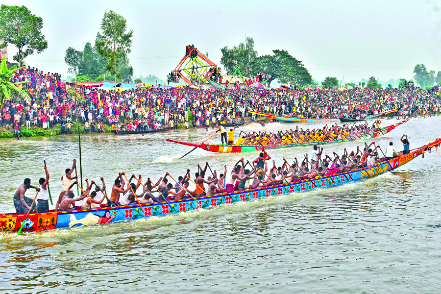 Thousands of people gather on the bank of Ichhamoti river at Toronihat in Gabtoli upazila, Bogura, to enjoy the traditional boat race organised by Baliadighi Union Community Police on Saturday. — Photo: Collected
