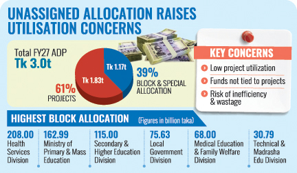 Experts and economists say several ministries and divisions often fail to utilise even their project-specific allocations, raising concerns that block allocations may remain underutilised and merely inflate the size of the ADP.