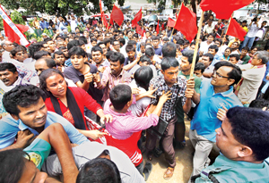 Several hundred protesters marched on the office of country's apex trade body at Karwan Bazar in the capital at about 11:40am. Police were reinforced, and they charged baton to drive back the protesters.