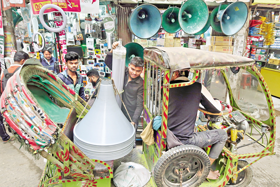 Two people load loudspeakers and other audio equipment into a motorised rickshaw at Patuatuli in Old Dhaka on Monday. Sales of sound accessories have risen across the country ahead of the 13th national election. — FE photo by Shafiqul Alam