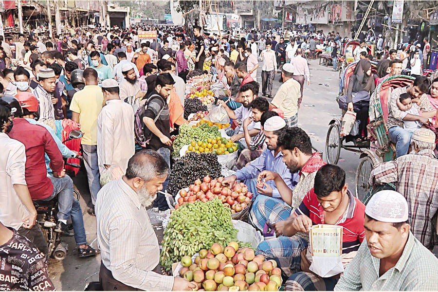 Vendors selling fruits on a raised road median in Gulistan area of the city on Friday, causing disruption to movement of vehicles and pedestrians — FE photo