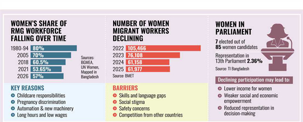 In 2026, according to Mapped in Bangladesh (MiB), a digital mapping platform of export-oriented garment factories, the proportion of women workers stands at 57 per cent, down from the earlier widely believed level of around 80 per cent.