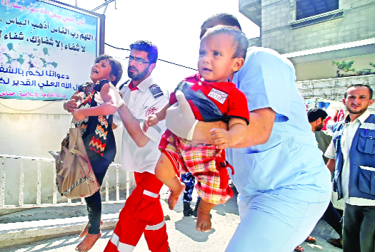 Wounded Palestinian children being taken to a hospital in Gaza City Friday. Israeli shelling killed eight people there on the day, just hours after a 72-hour humanitarian ceasefire took effect. Story on Page 1 — AFP