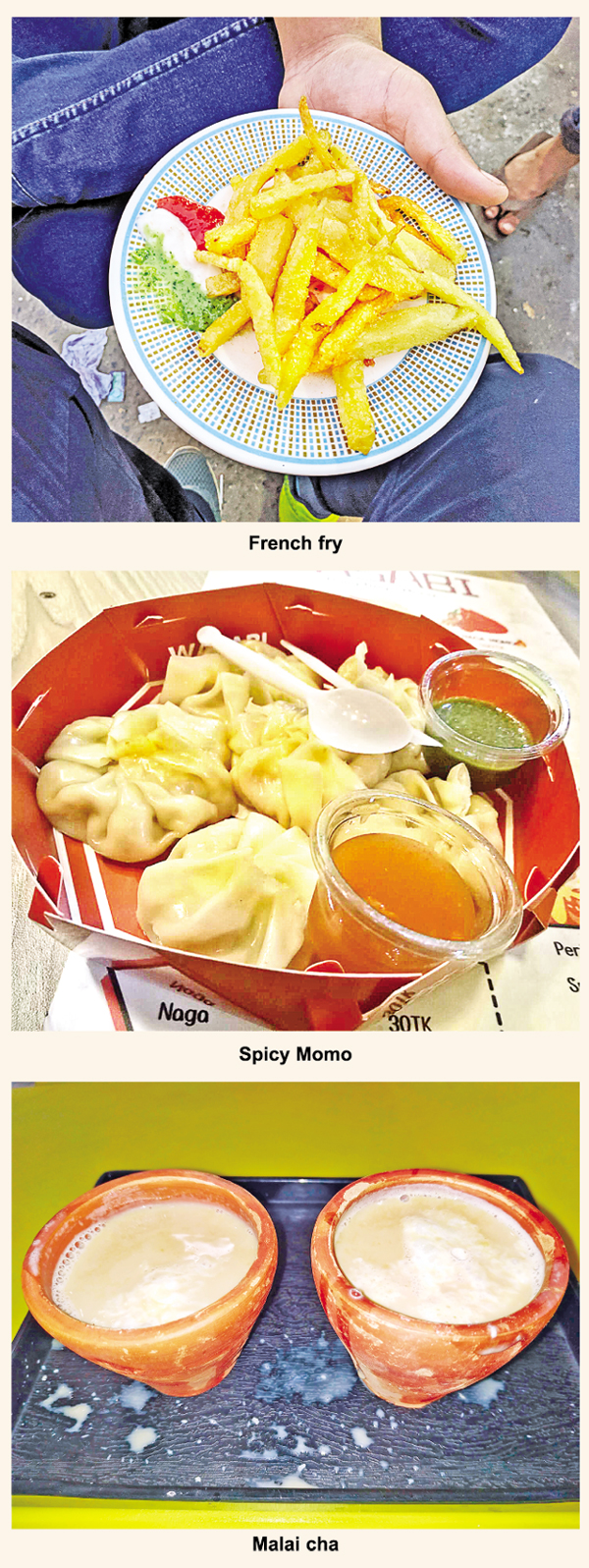 Soups, kebabs, kulfi of Salimullah Road, Townhall's Singapore juice corner, dosa, chats, and raj kachoris in front of Ring Road abound on the menu. Rafi Rahman, a 26-year-old Mohammadpur resident, said he preferred street food whenever he stepped out of the home since the food was good. The cool paanwala rustles up a flaming paan with his multi-coloured condiments, adding a shout of excitement to the already humming streets of Mirpur 1 Love Road. Order a tiny terracotta cup of sweetened 'Khandani tea' (a unique brew combined with nuts and topped with powdered milk) and dip the luchi; what else is needed for dessert? After all that gastronomic exploration, a kulfi in chocolate-filled malai -- the little icicles chill your mouth.