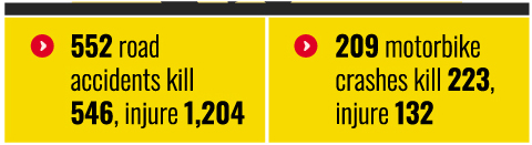 Motorcycle accidents accounted for a large share of fatalities. A total of 209 motorcycle crashes killed 223 people and injured 132, representing nearly 38 per cent of the total road accidents, around 41 per cent of total road deaths, and approximately 11 per cent of total injuries.