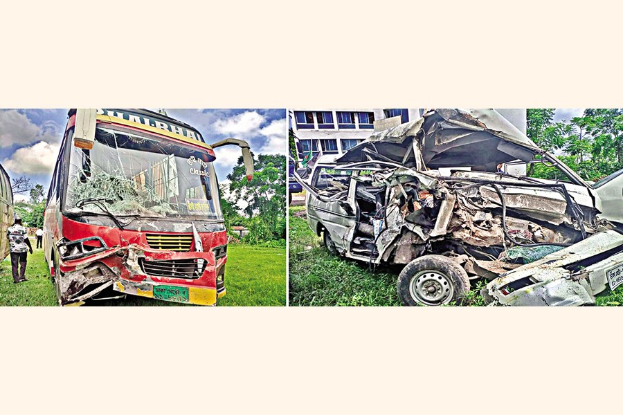 A passenger bus knocked down an ambulance on the Rangpur-Dinajpur highway near Kharubhaj Bridge of Taraganj upazila in Rangpur on Sunday, leaving three people, including a three-day-new-born, dead and two others injured — Focus Bangla