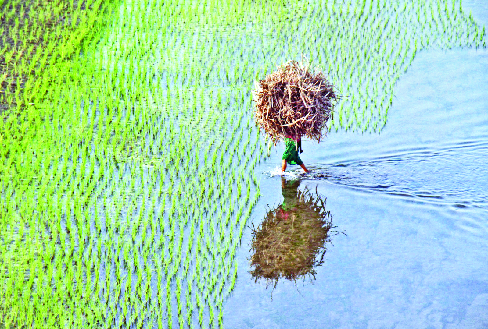 A vast track along the Jhenai River in Islampur upazila of Jamalpur district runs dry during the winter leading to emergence of large shoals (Char). Locals plant paddy on the sun-baked banks of the river after silt accumulation. In the picture, a peasant is carrying paddy seedlings to transplant them on the dry riverbed. — FE photo