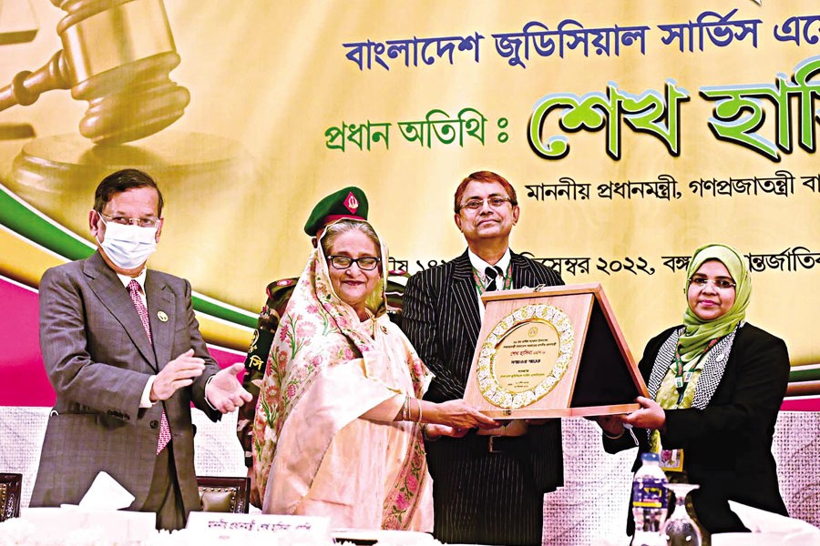 Bangladesh Judicial Service Association President AHM Habibur Rahman Bhuiyan presenting a crest to Prime Minister Sheikh Hasina at the inaugural session of the 59th Annual Council of the Bangladesh Judicial Service Association in city's Bangabandhu International Conference Center on Monday — PID Photo