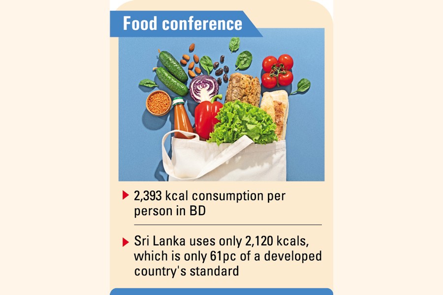 Our DU Correspondent adds: Only 2,393 kcals (kilocalories) per person, per day are consumed in Bangladesh, covering 67 per cent of a developed country's standard.