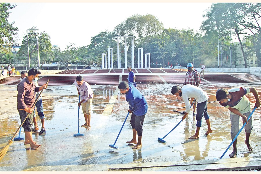 The Central Shaheed Minar in the capital being cleaned on Sunday ahead of the Language Martyrs' Day and the International Mother Language Day, to be observed on February 21. — Focus Bangla