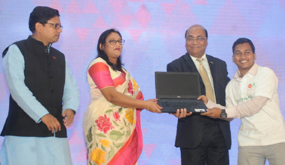 Chairperson of the National Advisory Committee on Autism Saima Wazed Hossain hands over laptops to handicapped people at BCC Auditorium in the capital on Sunday. - PID