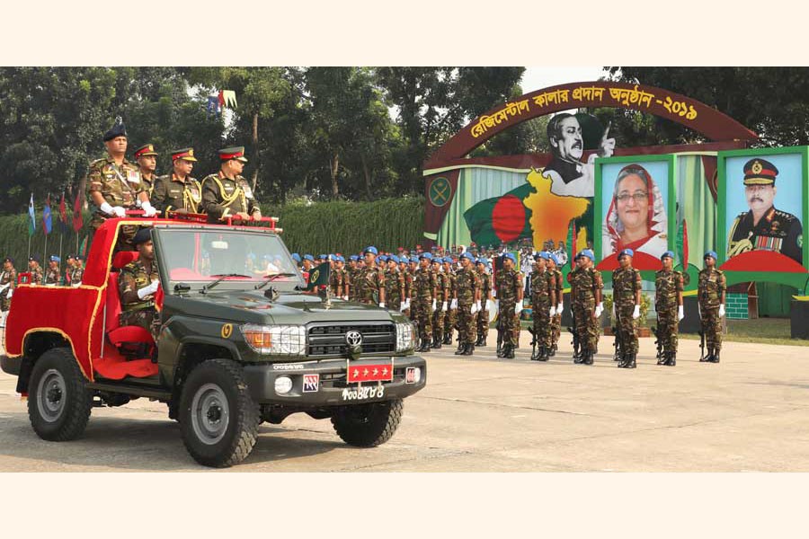 Chief of Army Staff General Aziz Ahmed reviewing the parade at regimental colour handover ceremony of the 8 Field Regiment Artillery, 12 Field Regiment Artillery, 36 AD Regiment Artillery, 3 Engineer Battalion and 1 Signal Battalion at the 55 Infantry Division Signal Training Centre and School in Jashore Cantonment on Wednesday — ISPR