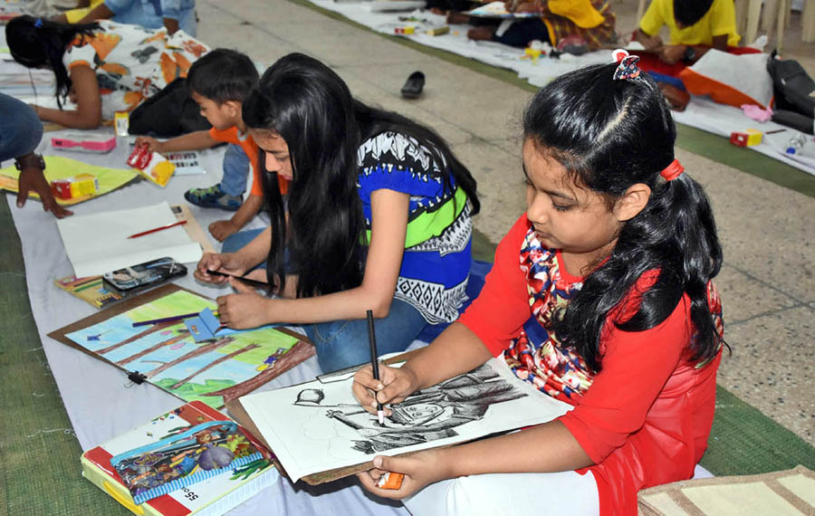 Children participating in an art competition on the National Press Club premises in the city on Saturday, marking the birthday of Father of the Nation Bangabandhu Sheikh Mujibur Rahman and the National Children's Day-2019 — FE Photo