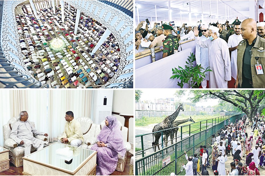 (Clockwise, from left-top): City dwellers offering their Eid prayers at the Baitul Mukarram National Mosque in the capital on Saturday, Chief Adviser Professor Muhammad Yunus exchanging greetings with devotees after the Eid prayers at the National Eidgah, Army Chief General Waker-Uz-Zaman along with his wife paid a courtesy call on the Chief Adviser at the State Guest House Jamuna on Saturday, and rush of enthusiastic visitors at the National Zoo during the Eid holiday on Monday. —Focus Bangla