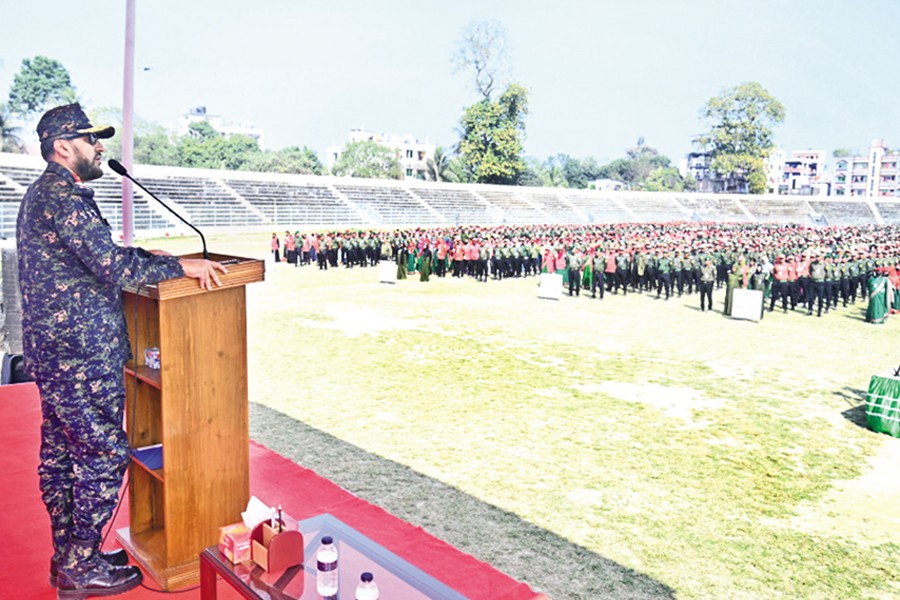 Director General of Bangladesh Ansar and Village Defence Party (Ansar-VDP) Major General Abdul Motaleb Sazzad Mahmud speaking as the chief guest of a preparatory assembly of its members at Tangail District Stadium on Thursday ahead of the 13th Jatiya Sangsad election on Feb 12. — Press Release