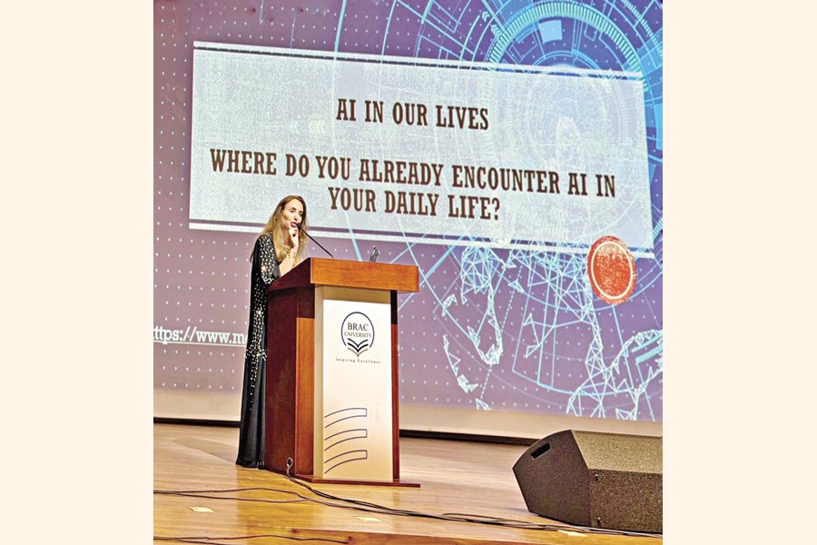 Education and language specialist Dr Noura El Sayed Rodríguez speaking at a workshop - on AI and digital tools in teaching of foreign languages - on BRAC University campus in the capital recently.