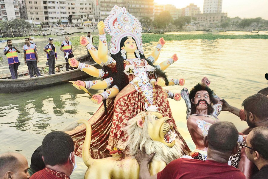 Worshippers immerse the idol of Goddess Durga in the Buriganga River on Friday, marking the end of the five-day celebrations of Durga Puja, the biggest religious festival of Hindu community — Focus Bangla