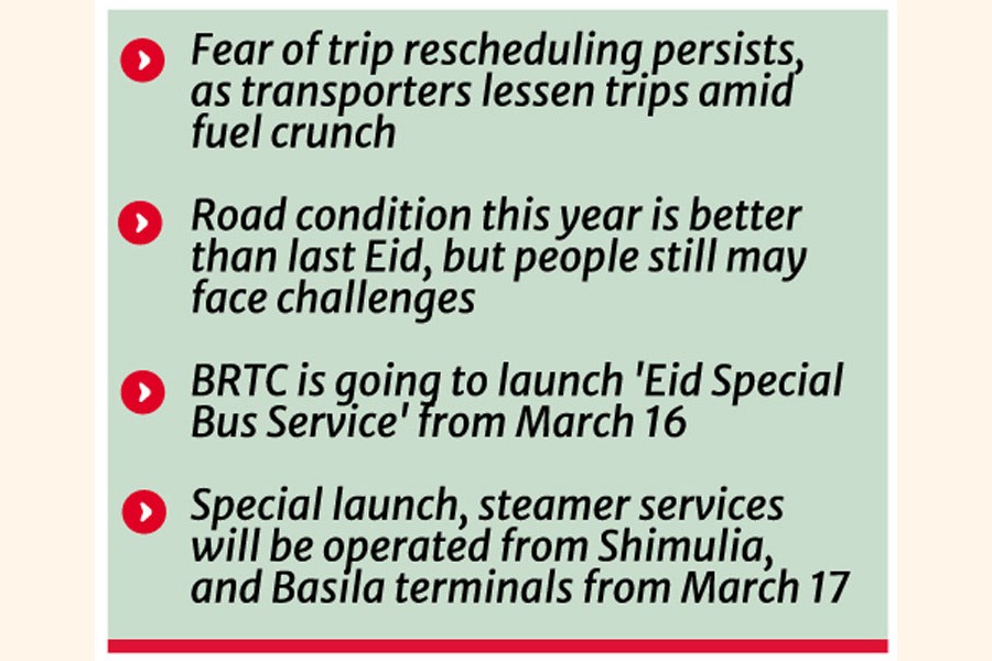Meanwhile, the Bangladesh Road Transport Corporation (BRTC) is going to launch 'Eid Special Bus Service' from March 16 to ensure safe travel of the Eid passengers. Advance ticket sales for the service started on Tuesday.