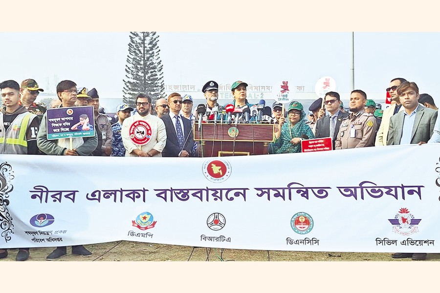 Environment, Forest and Climate Change Adviser Syeda Rizwana Hasan speaking at a rally, organised to raise public awareness on 'discouraging honking in declared silent zone' in the capital's airport area on Sunday. The Department of Environment, Dhaka Metropolitan Police (DMP), Bangladesh Road Transport Authority (BRTA), Dhaka North City Corporation (DNCC), and Civil Aviation Authority of Bangladesh jointly organised the event. — Press Release/BSS
