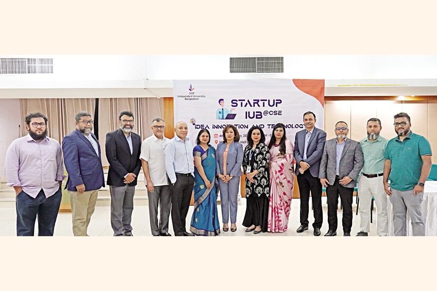Sonia Bashir Kabir, founder and managing director of SBK Tech Ventures, Sami Ahmed, managing director & CEO of Startup Bangladesh Limited, Wahidur Rahman Sharif, President of BACCO, Dr Tanjiba Rahman, chairman, Bangladesh Freelancer Development Society, Sohael Reza, CEO of ADN DigiNet Limited, among others, attend a flagship event titled Startup IUB@CSE on the Independent University, Bangladesh (IUB) premises in the city on Monday. Department of Computer Science and Engineering of IUB organised the programme
