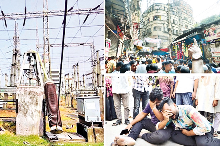 (Clockwise, from left): Damaged power plant at Ghorashal in Narsingdi; a building at Bangshal in Old Dhaka, whose collapsed wall killed three persons; and relatives of the deceased wailing at Mitford Hospital. — FE/Focus Bangla Photos