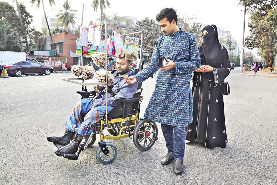 Instead of depending on others' mercy, Arman Dewan, a physically-challenged person of Basila, earning his living by turning his wheelchair into a small grocery shop. He was spotted in the capital's Asad Gate area on Thursday. — FE Photo by K Asad-Uz-Zaman