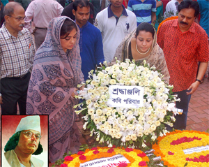 Family members of Kazi Nazrul Islam placing a wreath at the graveyard of the rebel poet on the Dhaka University Central Mosque premises marking the 38th death anniversary of the poet Wednesday. — Focus Bangla Photo