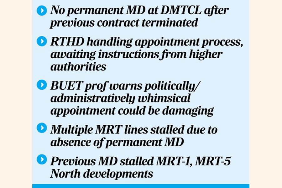 The question of who the next managing director (MD) of Dhaka Mass Transit Company Limited (DMTCL) will be remains unresolved, more than a month after the government cancelled the contract of the previous MD.