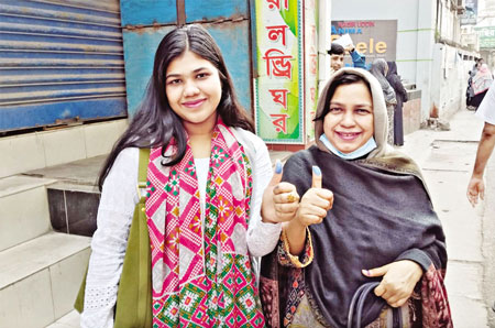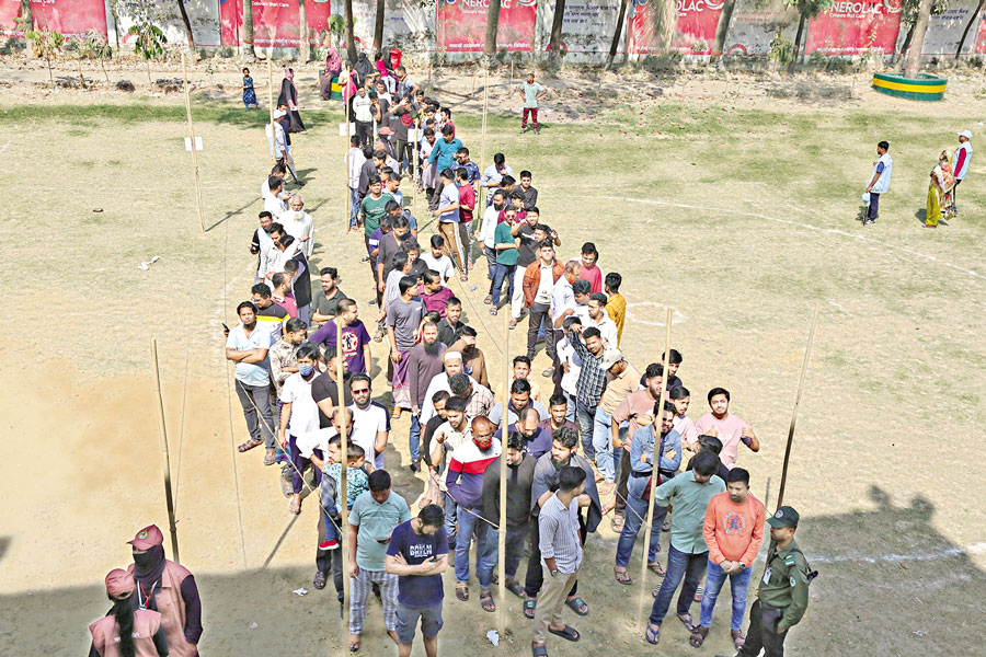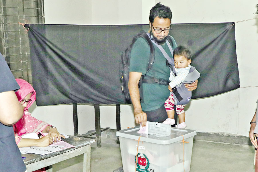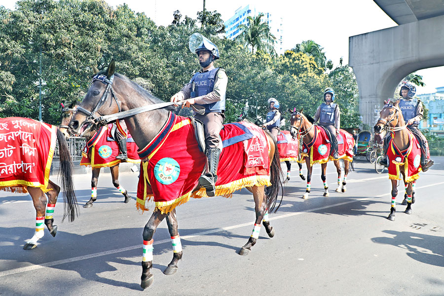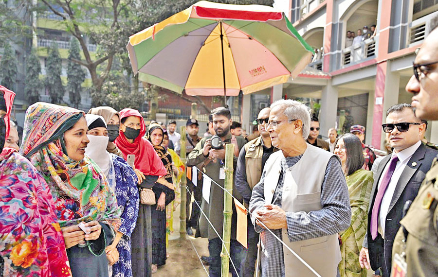 The 13th parliamentary election was held amid popular enthusiasm throughout the country on Thursday. People cast their ballots for their preferred candidates without any hindrance. The following are some of the snapshots taken during the polls. (Anti-clockwise from top right) Members of Dhaka Metropolitan Police on horseback conduct a patrol in front of the National Press Club urging people to go to the polling stations. Chief Adviser Prof Muhammad Yunus interacts with voters at Gulshan Model High School and College. BNP Chairman Tarique Rahman, his wife Dr Zubaida Rahman and his daughter Zaima Rahman celebrate after exercising their franchise. A father with his child on his lap drops a ballot paper at National Ideal School in Khilgaon. Braving physical limitations, an elderly man with the help of his son arrives at Banasree Ideal School to cast his vote. People wait in long queues to vote at Kalshi Islamia High School in Mirpur. A teenage girl who votes for the first time with her mother is all smiles at World View International School in Rampura. — FE and Focus Bangla photos