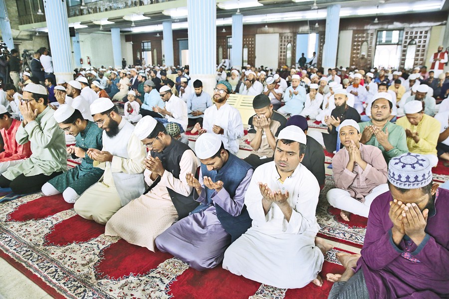 Devotees offering munajat in the Baitul Mukarram National Mosque in the capital after Jum'a prayers on Friday. Special prayers were arranged in the mosques across the country following BNP's landslide victory in the 13th National Parliamentary Election on Thursday. — FE Photo