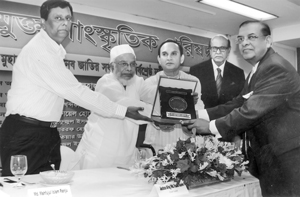 Dr M Mosharraf Hossain, past district governor of Rotary International District 3281, and chairman and managing director of Rapport Bangladesh Limited, receiving a crest of honour from former chief justice Fazlul Karim at a function organised by Unmukta S