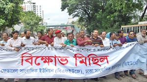 Members of Bangladesh Federal Union of Journalists (BFUJ) and Dhaka Union of Journalists (DUJ) staged a demonstration in front of the National Press Club protesting Social Welfare Minister Syed Mohsin Ali\'s indecent remarks about newsmen. — Focus Bangla