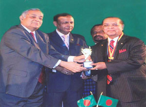 Rtn Dr M Mosharraf Hossain, district governor (1994-95) of Rotary district 3281 Bangladesh, receiving gold medal and trophy from former chief justice Tafazzal Islam for his outstanding contribution in social works at a function organised by Mohanagari Cul
