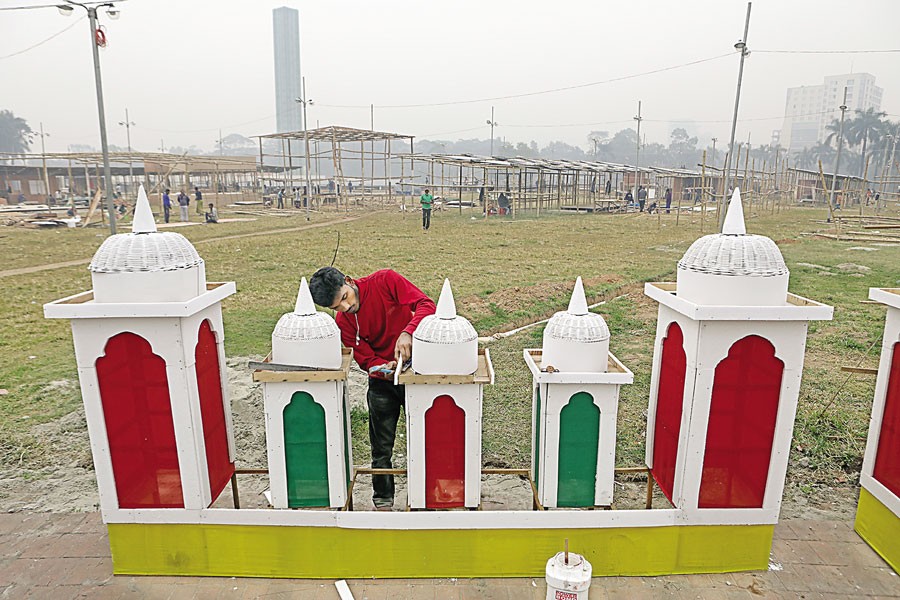 The preparation for Amar Ekushey Book Fair 2021 is in progress as workers are busy erecting stalls at the Suhrawardy Udyan segment of the fair in the city on Friday — FE Photo