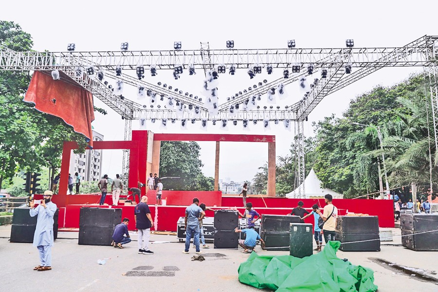 Preparations going on to set up a stage at Manik Mia Avenue in the capital on Monday for the day-long programmes commemorating the August 5 anniversary today (Tuesday), including reading out of the July Declaration. — FE Photo