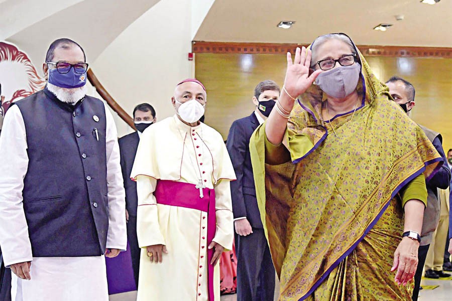 Prime Minister Sheikh Hasina waves to the crowds before boarding