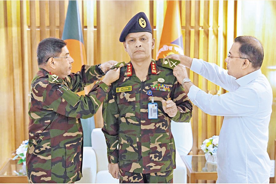Prime Minister Tarique Rahman, accompanied by Chief of Army Staff General Waker-Uz-Zaman, pinned the rank insignia of Lieutenant General on 24 Infantry Division GOC Major General Mir Mushfiqur Rahman in Dhaka Cantonment on Monday. — PID