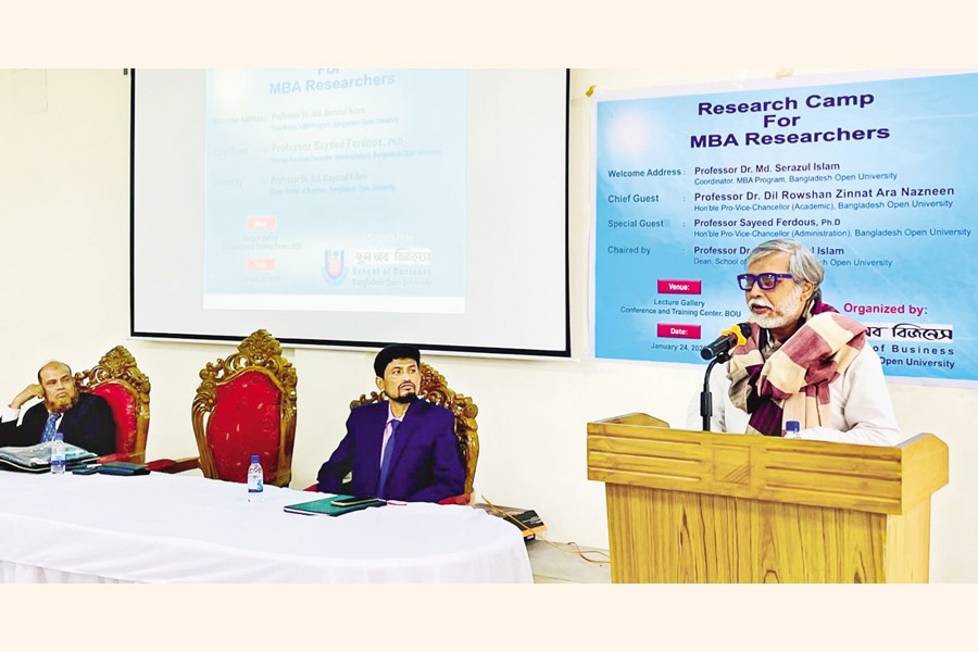 Pro Vice-Chancellor of Bangladesh Open University Prof Sayeed Ferdous speaking at a daylong research camp for MBA researchers on its campus in Gazipur recently.