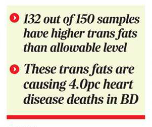 Due to high intake of industrial trans fats, around 2,78,000 people die every year in Bangladesh. Trans fats build up in blood vessels and increase the risk of heart attacks.