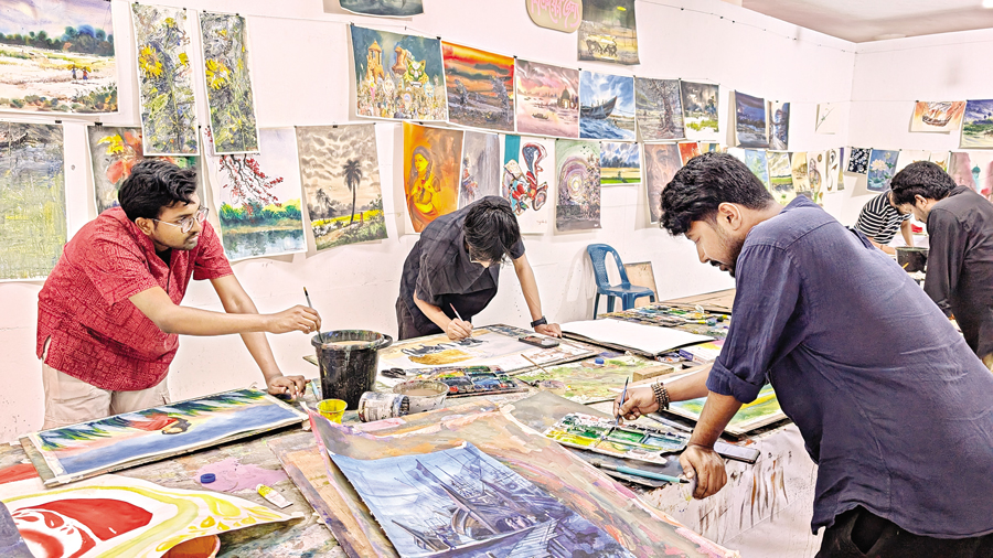 Students at the Institute of Fine Arts, Dhaka University, busy painting on Saturday ahead of 'Pohela