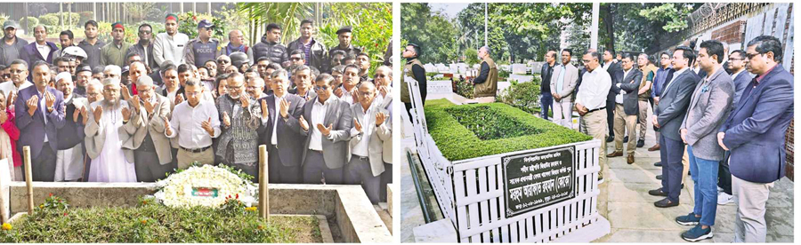 (Left) BNP Acting ChairmanTarique Rahman offering munajat after placing a wreath at the grave of slain political activist Sharif Osman Bin Hadi on the Dhaka University campus, and (right) standing in solemn silence beside the grave of his younger brother Arafat Rahman at the Banani Graveyard in the capital on Saturday. — FE Photos Story on Page 1