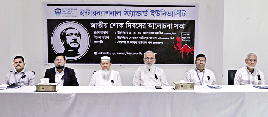 Vice Chancellor of International Standard University Prof Dr Abdul Awal Khan and Chairman of Board of Trustees of the university Engr AKM Mosharraf Hussain, among others, at a discussion on its Mohakhali campus in the city on Monday, marking the 47th martyrdom anniversary of Father of the Nation Bangabandhu Sheikh Mujibur Rahman