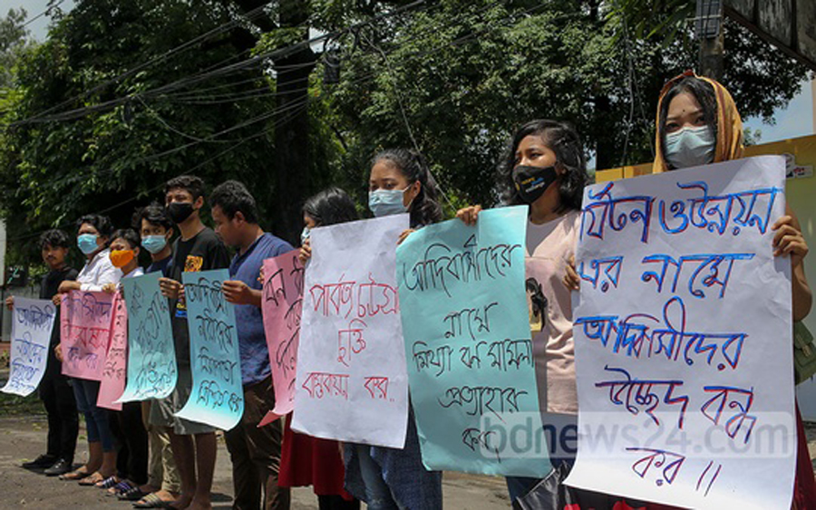 Bangladesh Adibasi Chhatra Sangram Parishad and Adibasi Jubo Forum formed a human chain at Shahbagh in the city on Friday demanding justice for a Koch woman who was gang-raped in Tangail and protesting eviction of tribal people in the name of tourism development — bdnews24.com